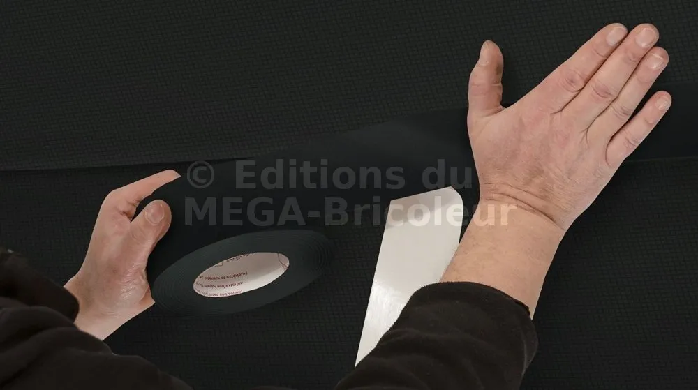 - MatériauColle en acrylique pur, exempte de solvants et de plastifiants, appliquée sur un film PE armé noir et associée en sous-face à un film pelable.