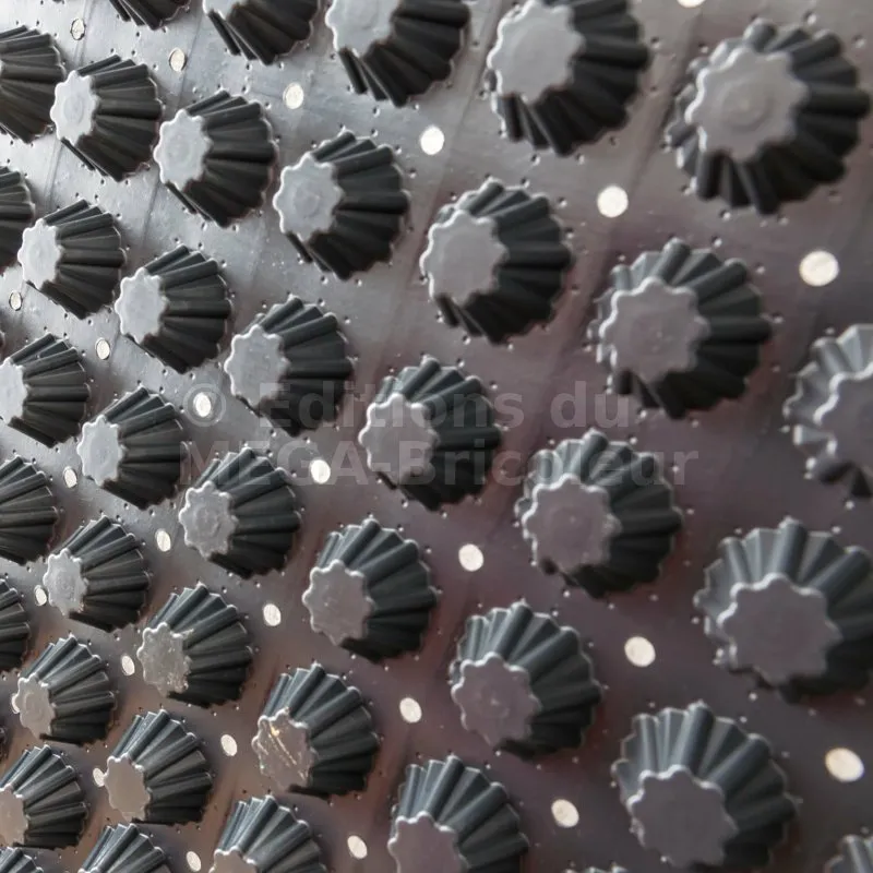 - Les alvéoles octogonales permettent de stocker jusqu’à 7 litres/m² d’eau, l’excédent d’eau s’écoule ensuite sous la membrane via les perforations entre les alvéoles. La membrane est écologique et résistante aux produits chimiques, aux bactéries, aux substances alcalines et aux racines.