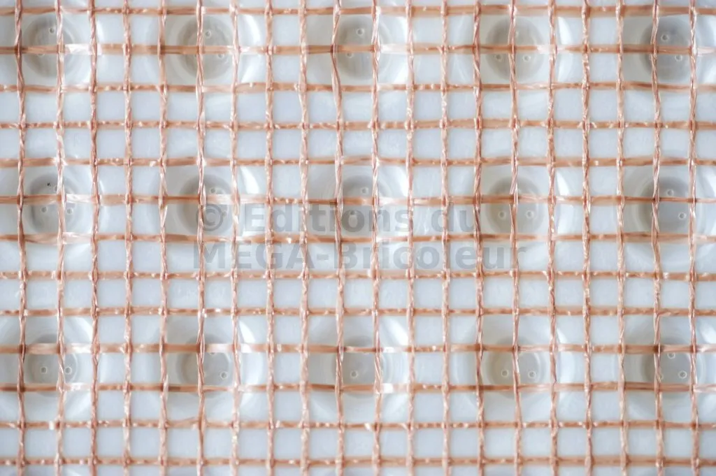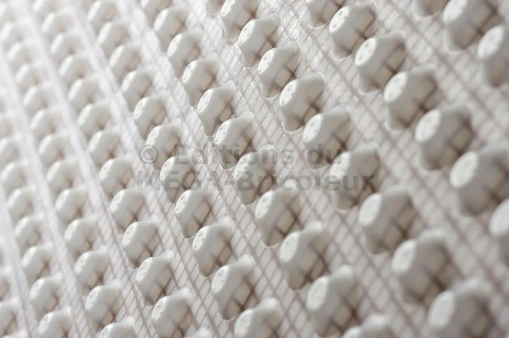 - MatériauNappe à excroissances en polyéthylène haute densité associée à un treillis en polyéthylène brun.