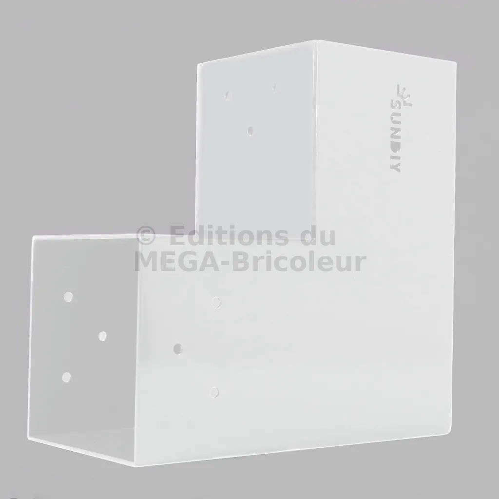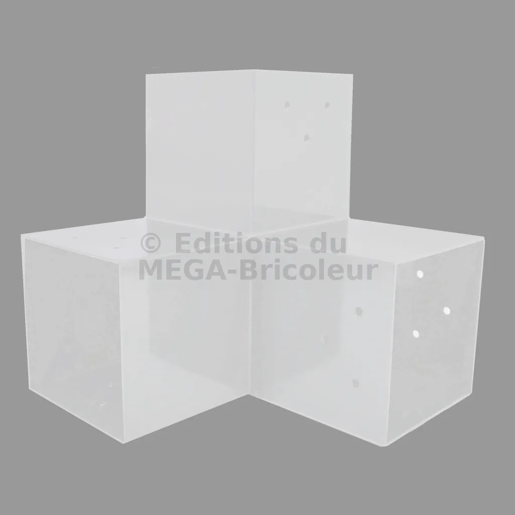 Il est utilisé dans un angle extérieur. Ce connecteur va permettre de raccorder une grosse poutre 120x120mm perpendiculairement à une poutre 120x120mm, le tout étant supporté par un poteau vertical 120x120mm.