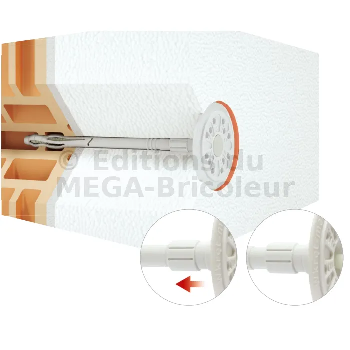 Ce connecteur télescopique en plastique novateur garantit un montage sans erreur lors de la fixation du polystyrène dans différents matériaux de la tête, conformément à la norme ETAG 014 pour les systèmes ETICS.
