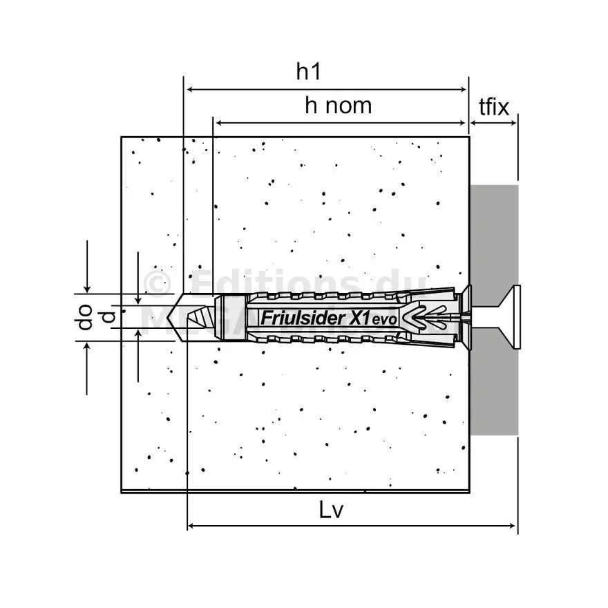 | Références | Dimensions [d0xL] [mm] | Ø vis (Min/Max) | Ø perçage [d0] [mm] | Profondeur mini perçage* [h1] [mm] | Profondeur d’ancrage nominale* [hnom] [mm] | |