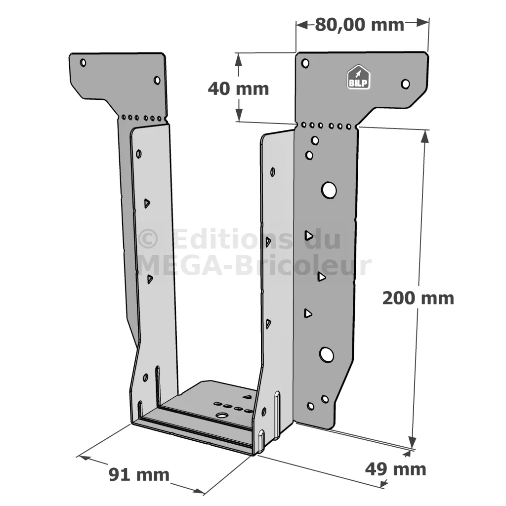 - Étrier fourni avec ses brides supérieures droites, pliables sur chantier afin de s’adapter à toutes les hauteurs de solives,