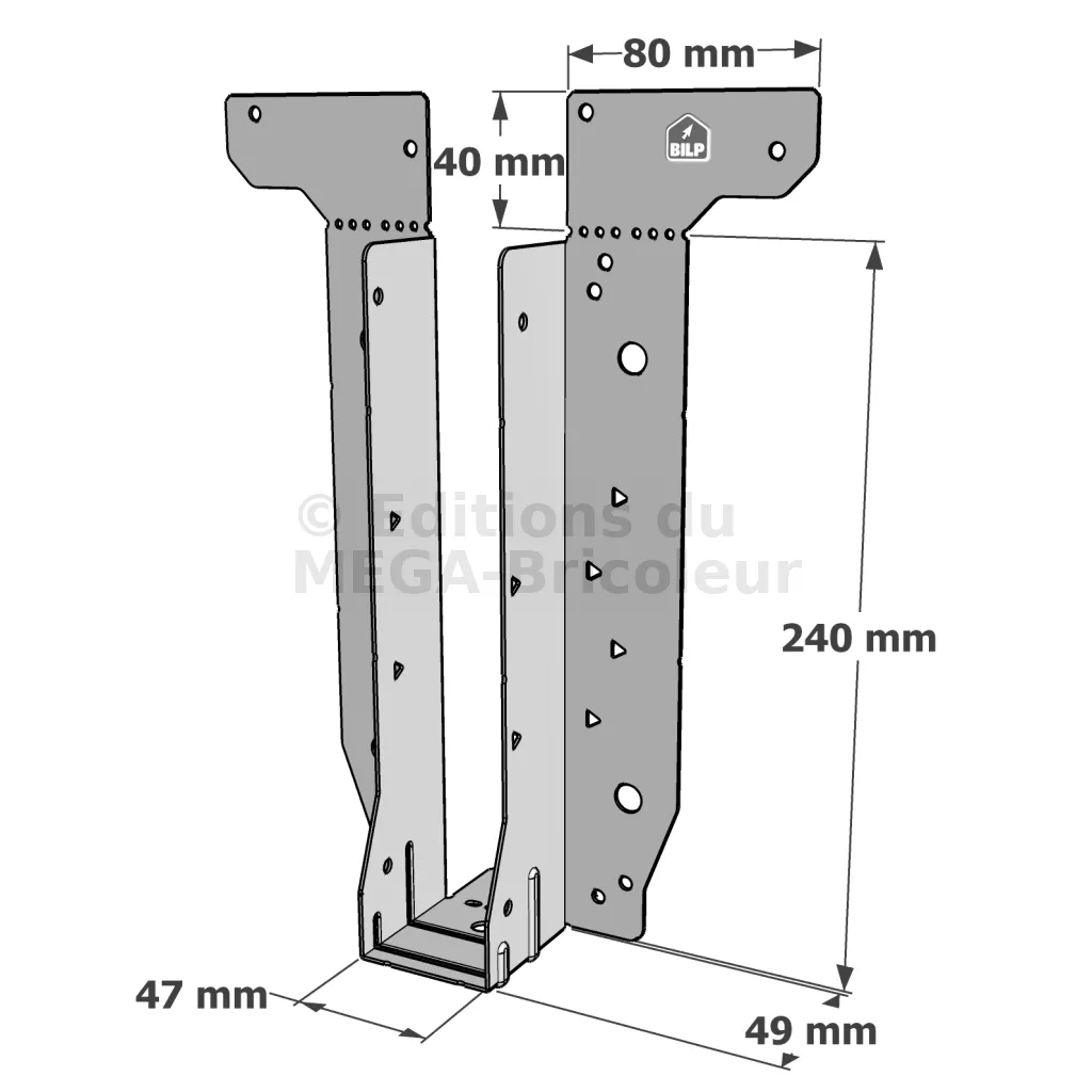 - Étrier fourni avec ses brides supérieures droites, pliables sur chantier afin de s’adapter à toutes les hauteurs de solives,