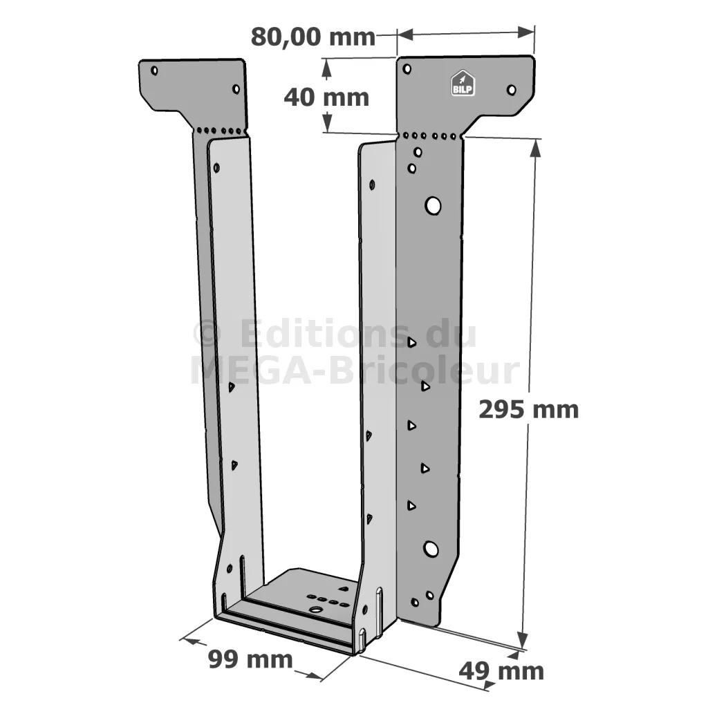 - Étrier fourni avec ses brides supérieures droites, pliables sur chantier afin de s’adapter à toutes les hauteurs de solives,