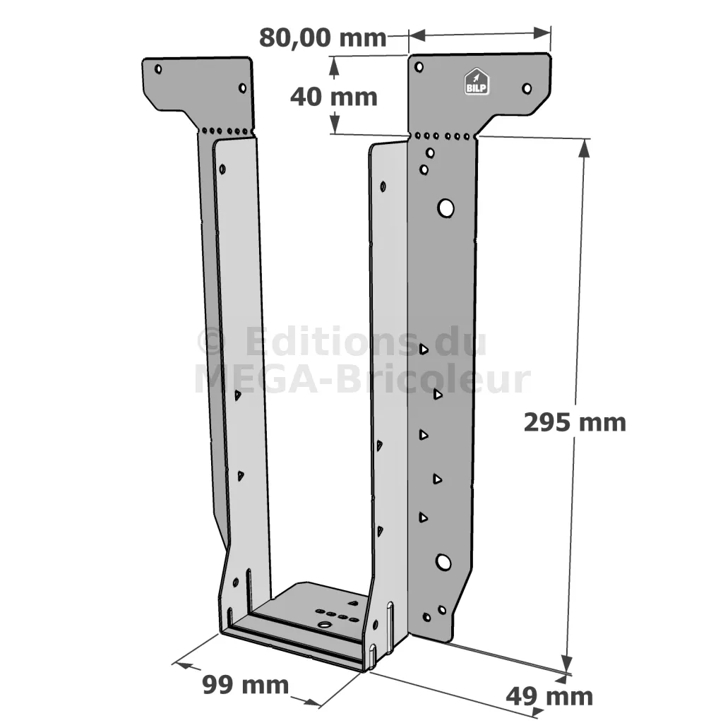 - Étrier fourni avec ses brides supérieures droites, pliables sur chantier afin de s’adapter à toutes les hauteurs de solives,