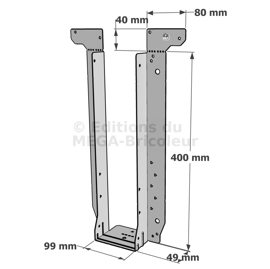 - Étrier fourni avec ses brides supérieures droites, pliables sur chantier afin de s’adapter à toutes les hauteurs de solives,