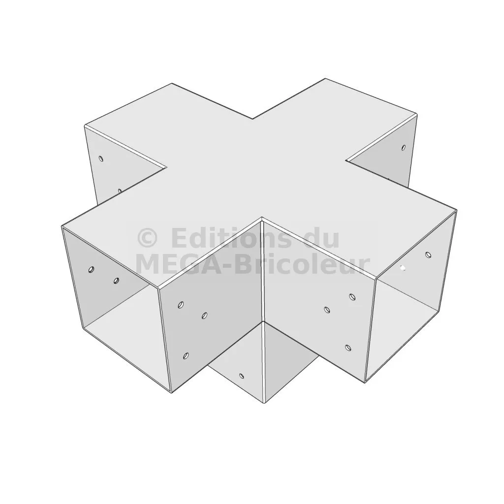 Il permet de raccorder deux poutres 120x120mm perpendiculairement à une autre poutre 120x120mm, le tout étant supporté par un poteau vertical de 120x120mm.