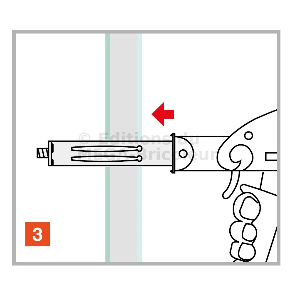 La cheville est disposée dans le perçage sur le support avec une pince dédiée, l’action de la pince permet l’expansion et le verouillage de la cheville contre le support.