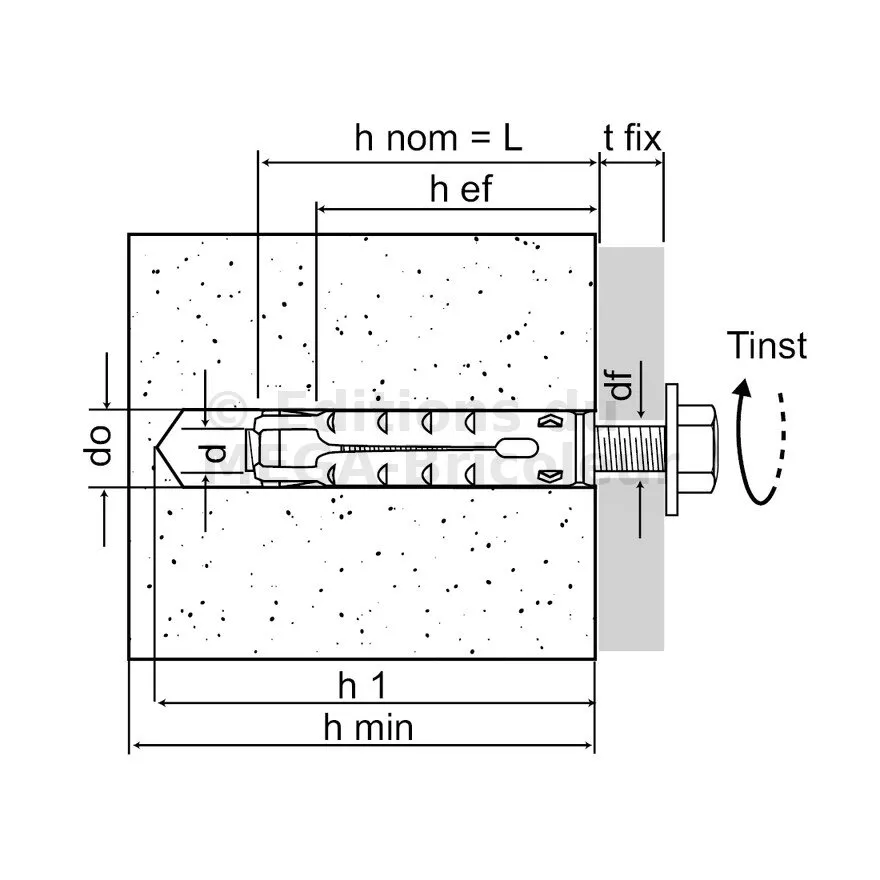 | Références | Référence | Ø perçage [d0] [mm] | Prof. min. de perçage [h1] [mm] | Ø perçage dans pce à fixer (au travers) [df] [mm] | Couple de serrage [Tinst] [Nm] | Prof. ancrage [hef] [mm] | Ep. mini du support [hmin] [mm] |