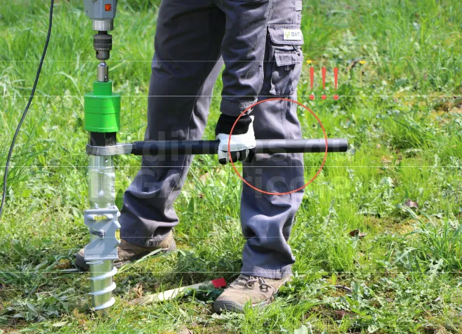 - La poignée permet à l’utilisateur de saisir l’outil fermement et d’appliquer le couple nécessaire pour visser la vis de fondation dans le sol. Sans une bonne poignée, il serait difficile d’exercer la force nécessaire pour enfoncer la vis.
