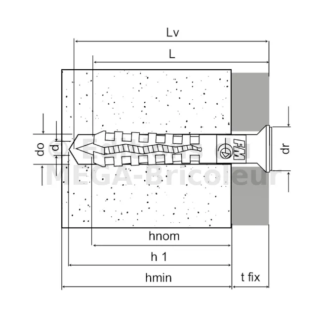 | Références | Réference produit | Dimensions [d0xL] [mm] | Ep. max élément à fixer [tfix] [mm] | Profondeur mini perçage [h1] [mm] | Profondeur d’ancrage nominale [hnom] [mm] | Ep. mini support [hmin] [mm] | Ø vis [d] [mm] | Longueur vis [Lv] [mm] | Ø colerette [dr] [mm] |