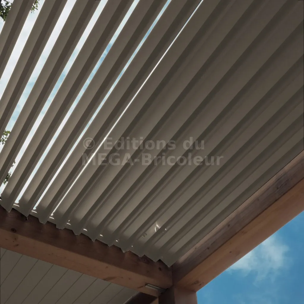 L’eau s’évacue aux extrémités des lames. Elles va donc couler sous les mécanismes. Il peut être judicieux d’ajouter des chenaux sous les mécanismes afin de conduire l’écoulement à l’extérieur de la pergola.