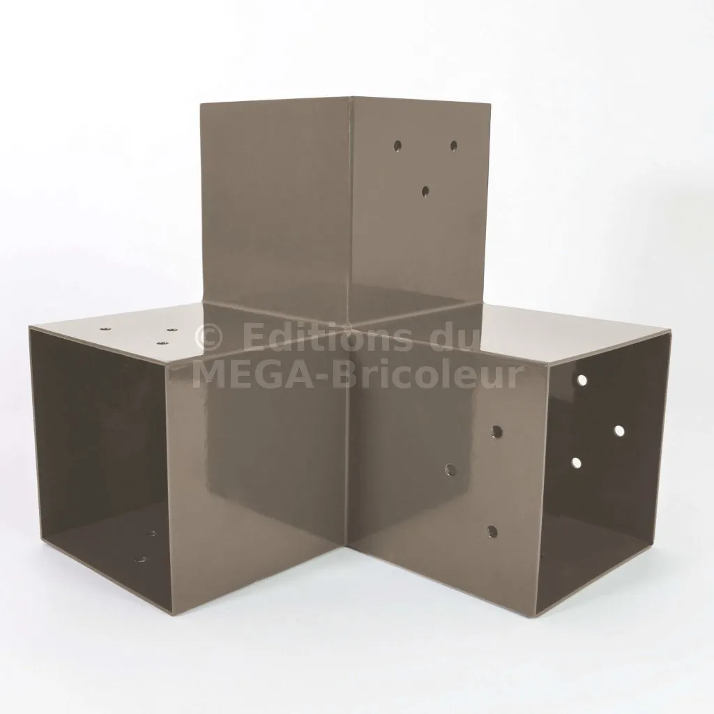 Il est utilisé dans un angle extérieur. Ce connecteur va permettre de raccorder une poutre 90x90mm perpendiculairement à une poutre 90x90mm, le tout étant supporté par un poteau vertical 90x90mm.