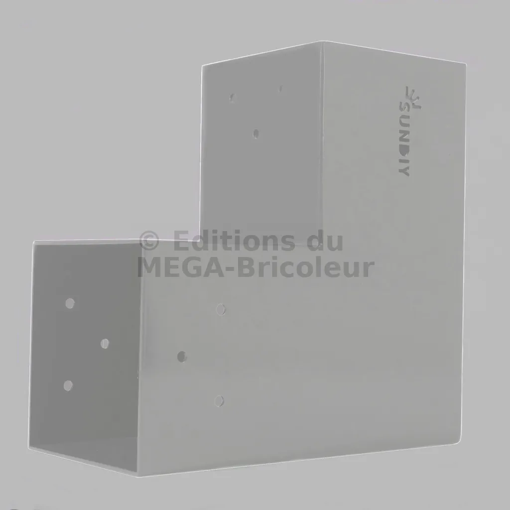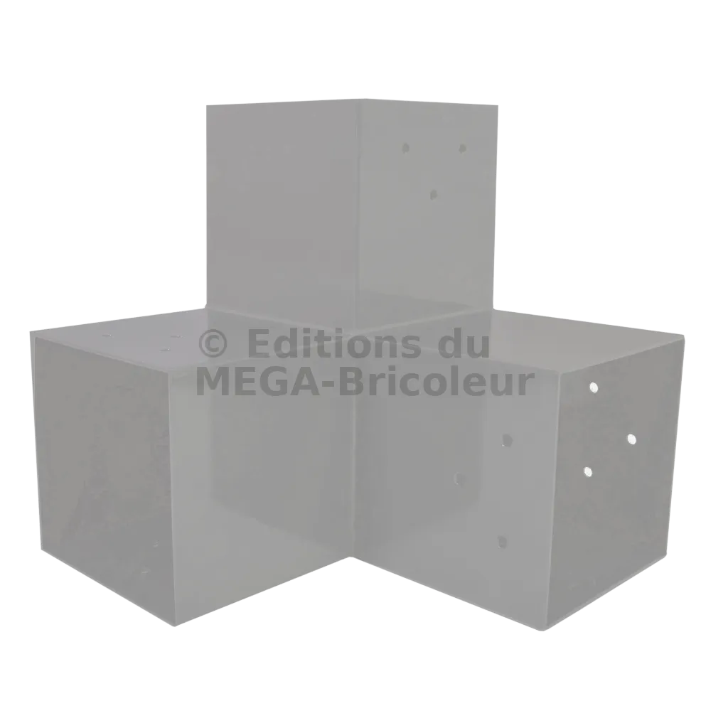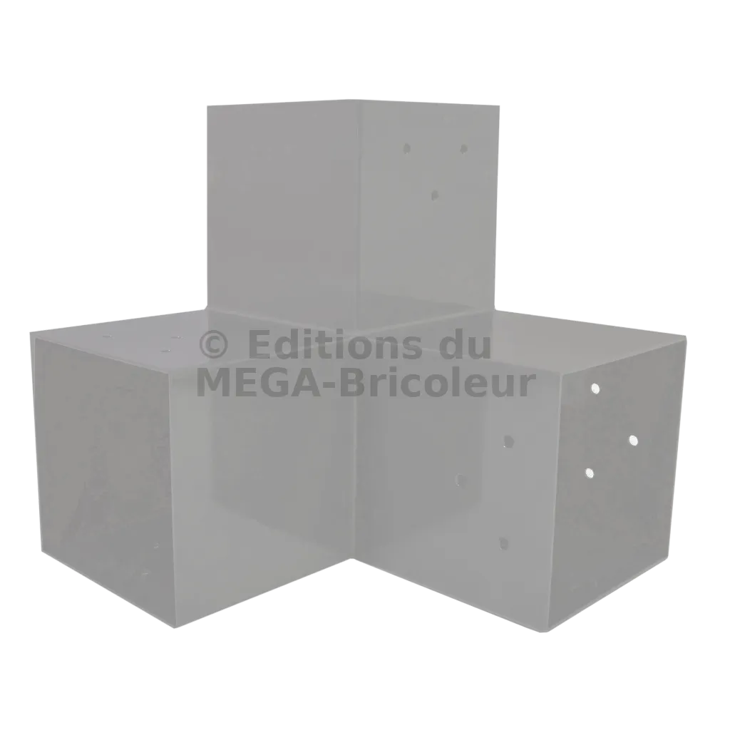 Il est utilisé dans un angle extérieur. Ce connecteur va permettre de raccorder une grosse poutre 120x120mm perpendiculairement à une poutre 120x120mm, le tout étant supporté par un poteau vertical 120x120mm.