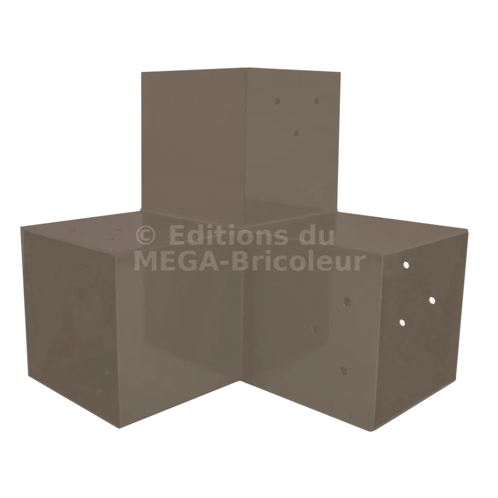 Il est utilisé dans un angle extérieur. Ce connecteur va permettre de raccorder une grosse poutre 120x120mm perpendiculairement à une poutre 120x120mm, le tout étant supporté par un poteau vertical 120x120mm.