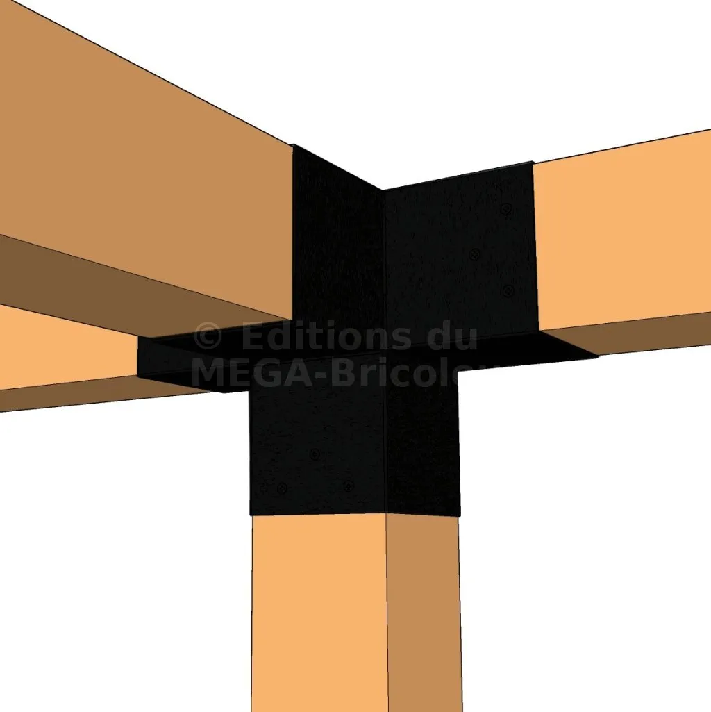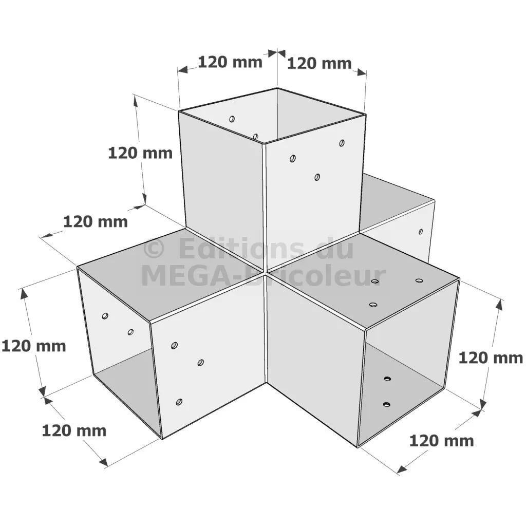 Il permet de raccorder une poutre de 120x120mm perpendiculairement à un chevron de 120x120mm, le tout étant supporté par un poteau vertical de 120x120mm.