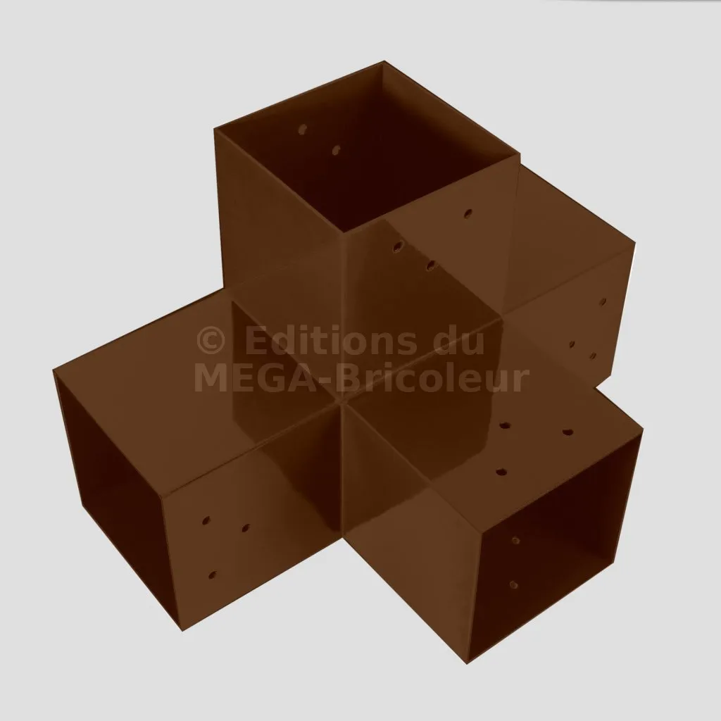 Il permet de raccorder une poutre de 120x120mm perpendiculairement à un chevron de 120x120mm, le tout étant supporté par un poteau vertical de 120x120mm.