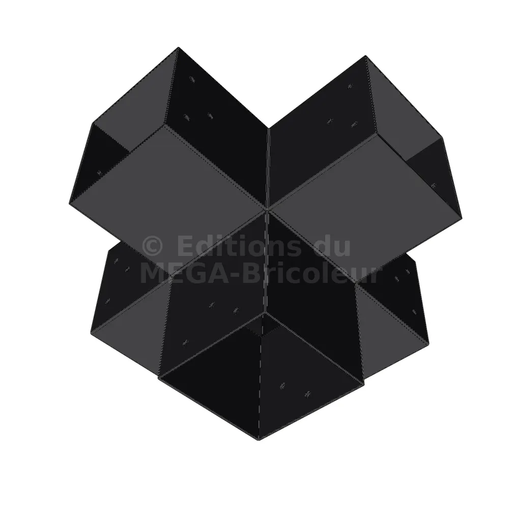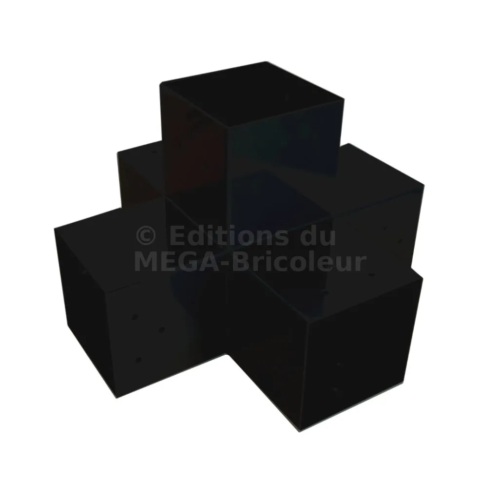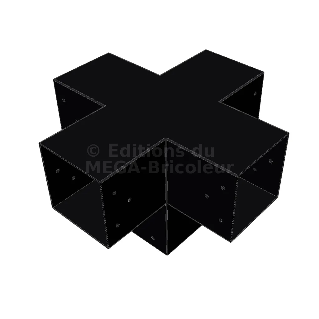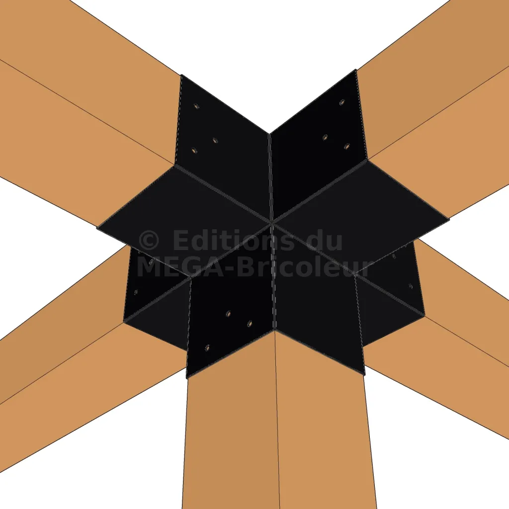 Il permet de raccorder deux poutres 120x120mm perpendiculairement à une autre poutre 120x120mm, le tout étant supporté par un poteau vertical de 120x120mm.