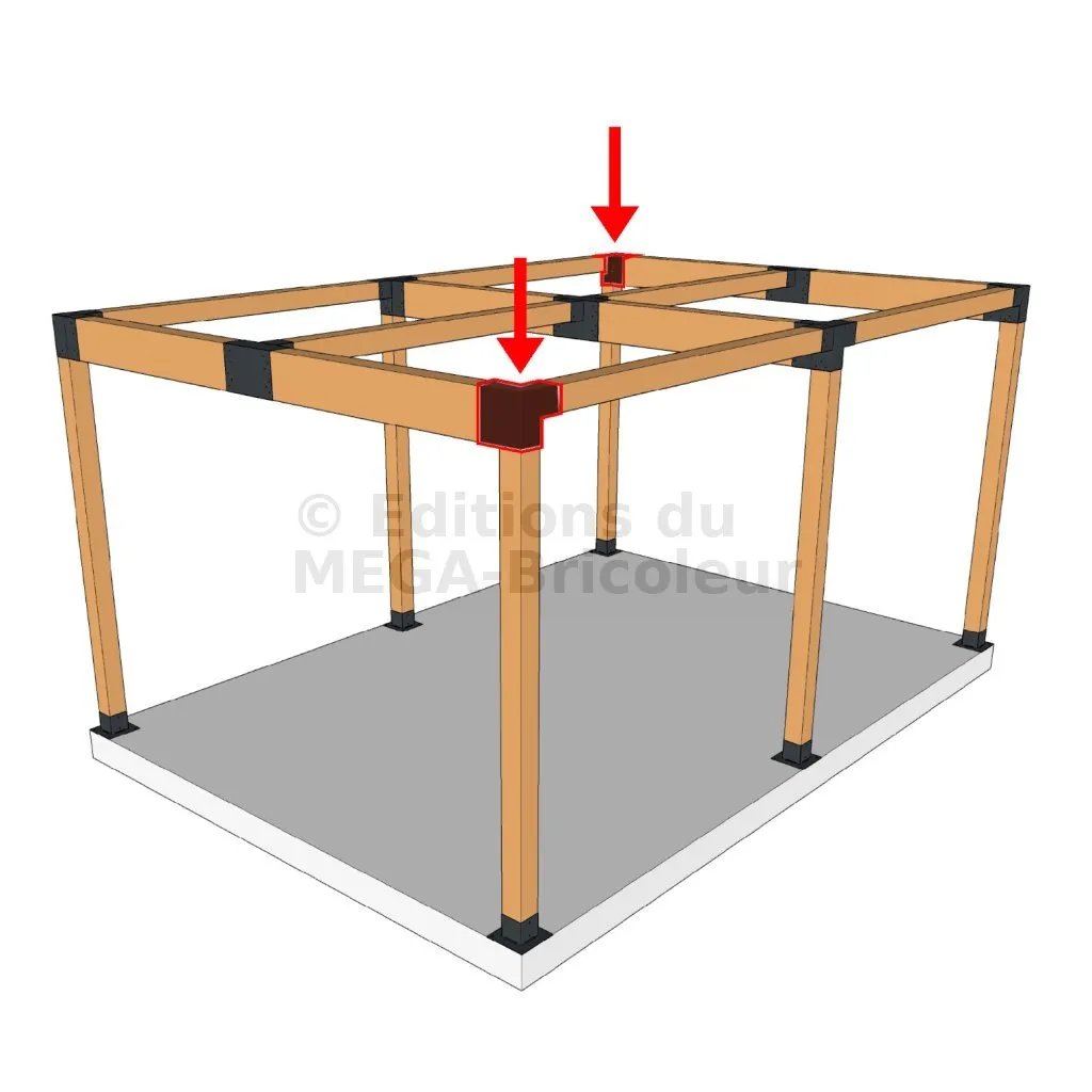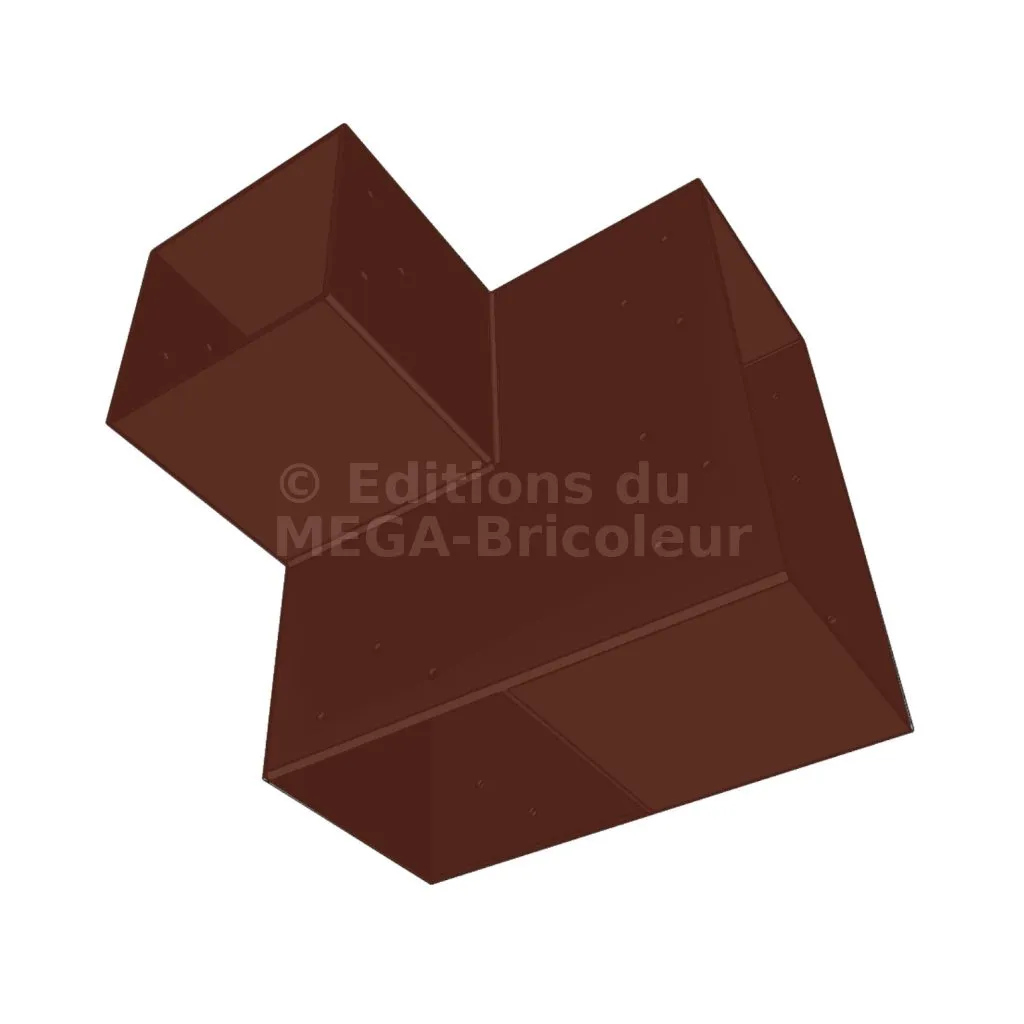Il est utilisé dans un angle extérieur. Ce connecteur va permettre de raccorder une grosse poutre 240x120mm perpendiculairement à une poutre 120x120mm, le tout étant supporté par un poteau vertical 120x120 mm.
