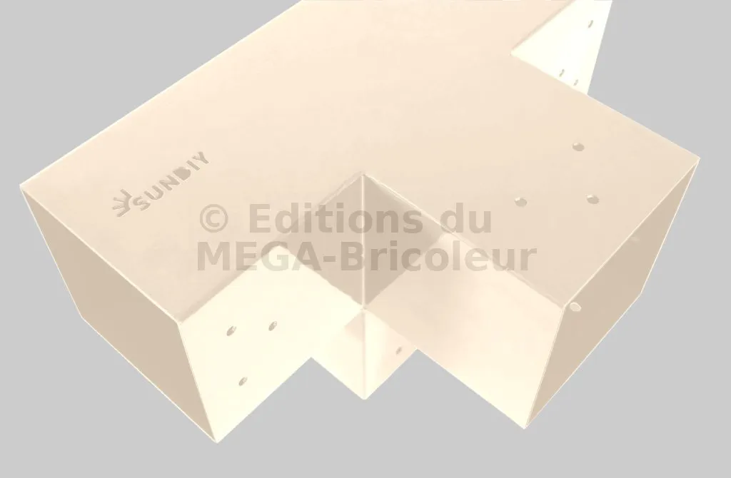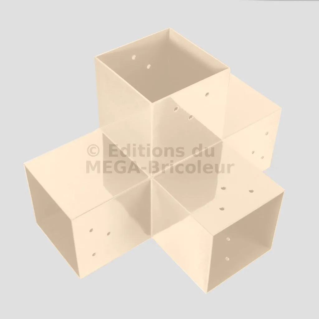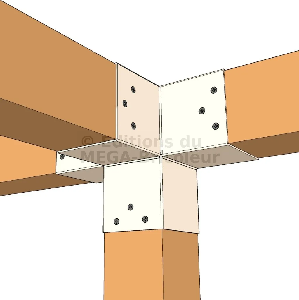 Il permet de raccorder une poutre de 90x90mm perpendiculairement à un chevron de 90x90mm, le tout étant supporté par un poteau vertical de 90x90mm.