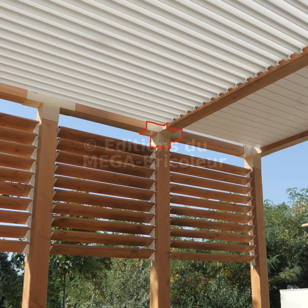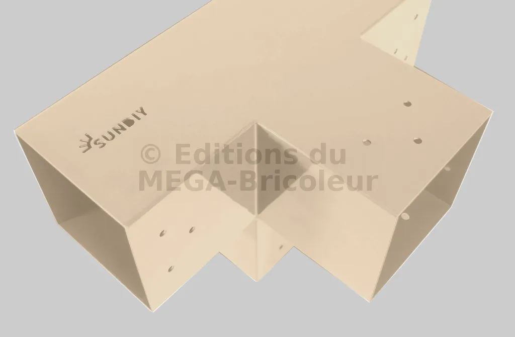 Il permet de raccorder une poutre de 120x120mm perpendiculairement à un chevron de 120x120mm, le tout étant supporté par un poteau vertical de 120x120mm.