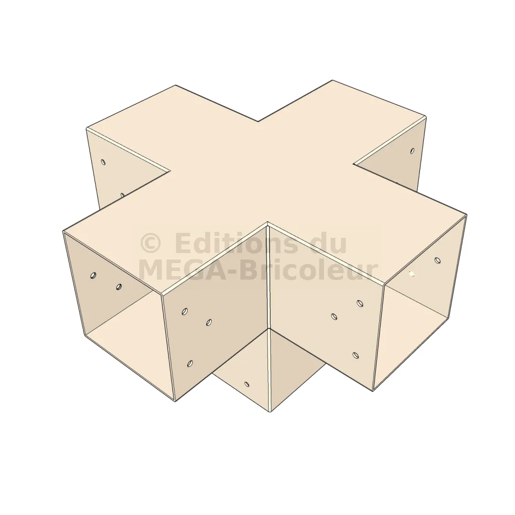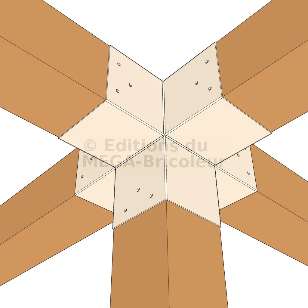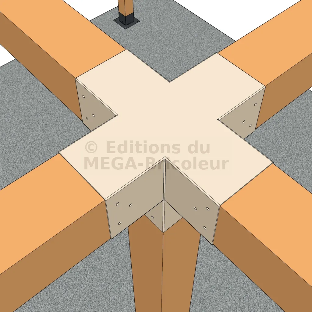 Il permet de raccorder deux poutres 120x120mm perpendiculairement à une autre poutre 120x120mm, le tout étant supporté par un poteau vertical de 120x120mm.