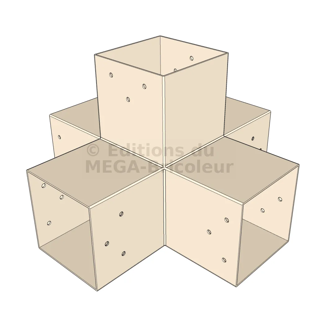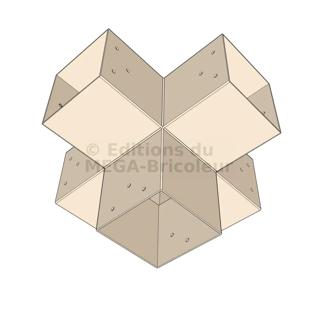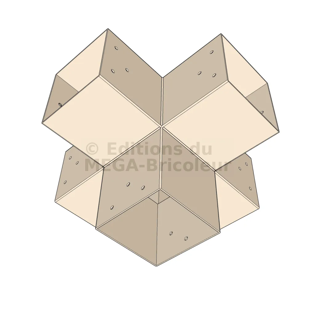 Il permet de raccorder deux poutres 120x120mm perpendiculairement à une autre poutre 120x120mm, le tout étant supporté par un poteau vertical de 120x120mm.