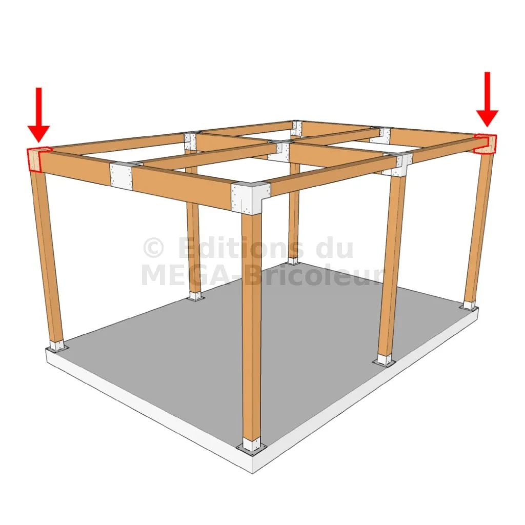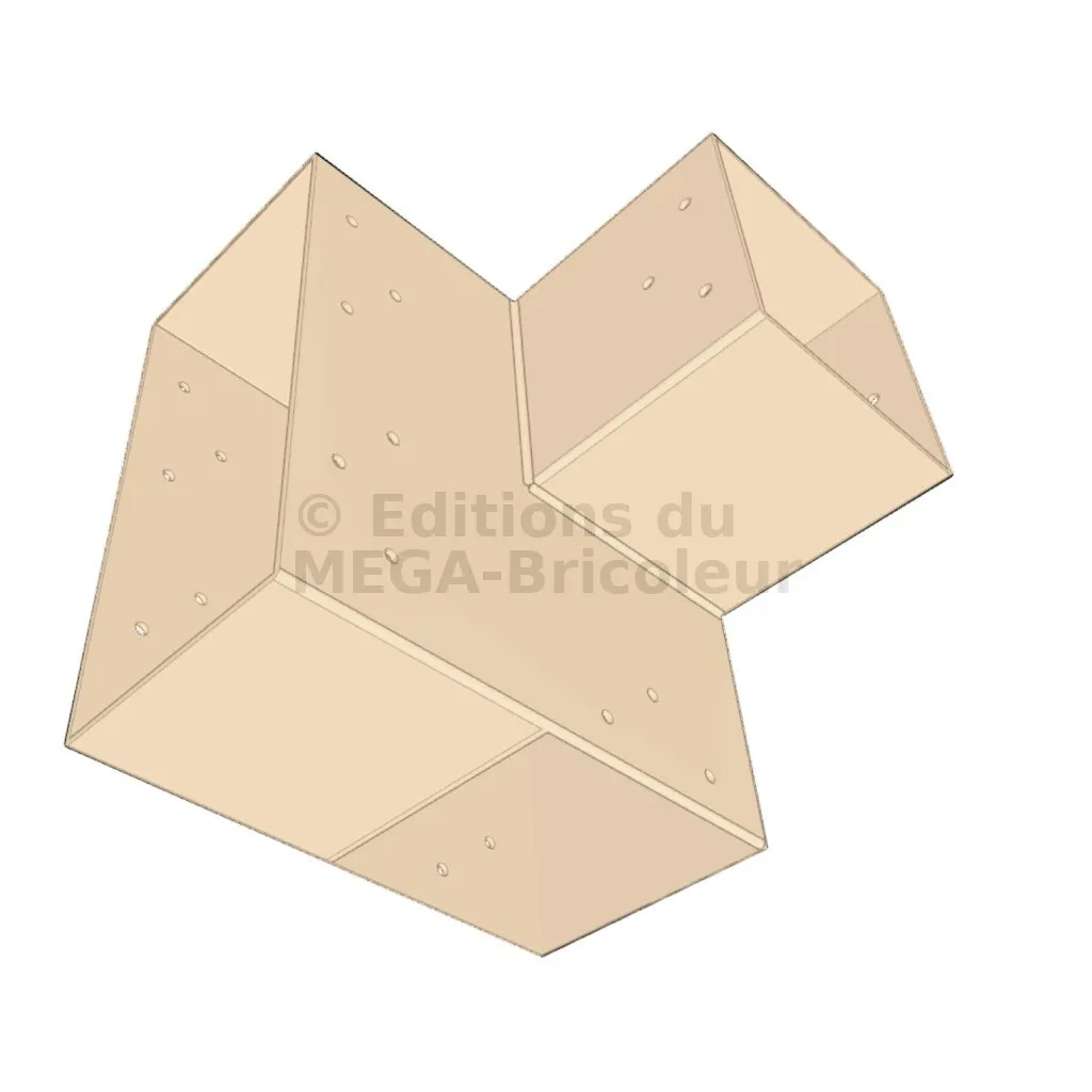 Il est utilisé dans un angle extérieur. Ce connecteur va permettre de raccorder une grosse poutre 240x120mm perpendiculairement à une poutre 120x120mm, le tout étant supporté par un poteau vertical 120x120mm.