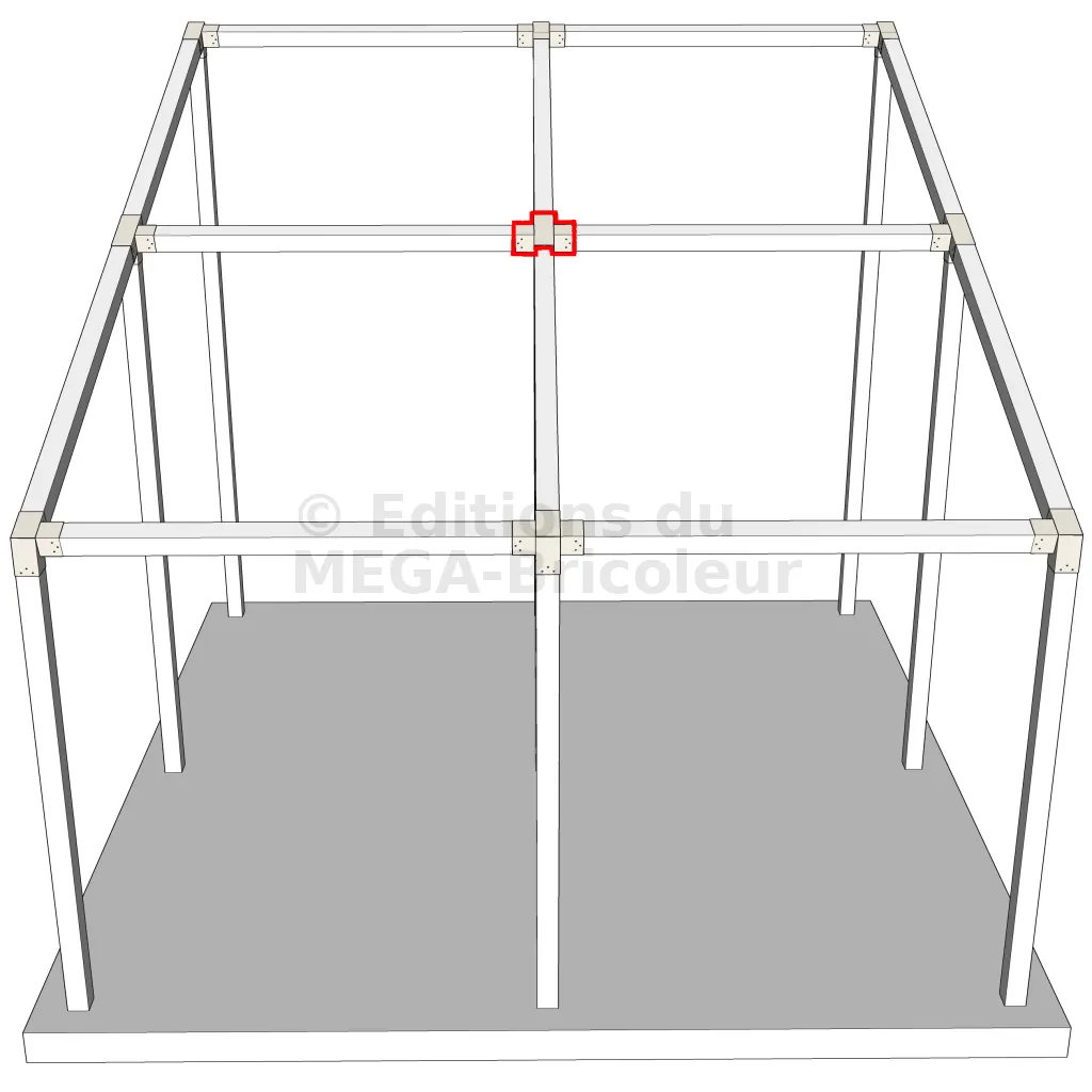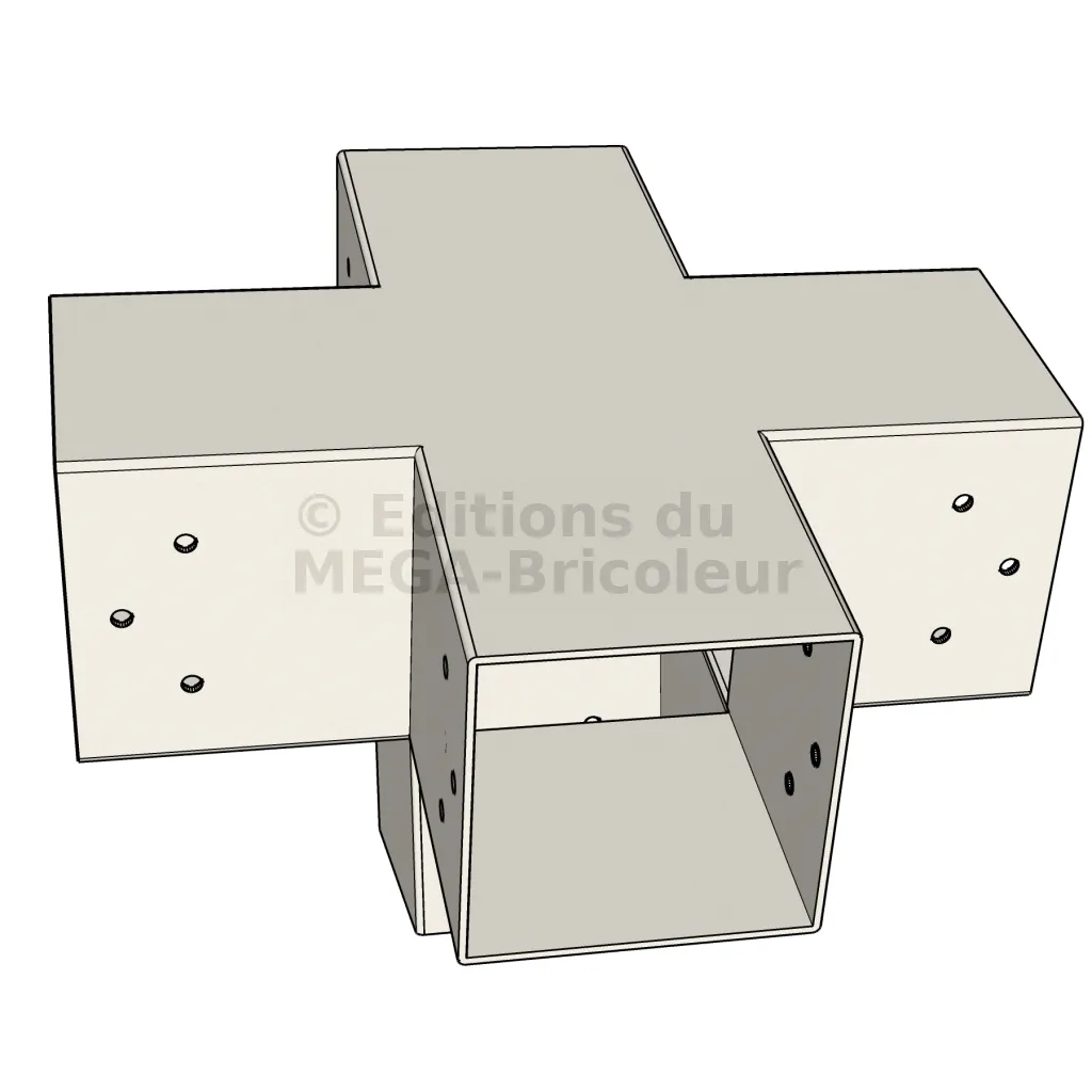 Connecteur métallique permettant l’assemblage précis de deux chevrons inclinés à 20°, de deux poutres horizontales et d’un poteau vertical central, tous de section 90x90 mm. Il garantit une liaison rigide et symétrique en un point central, assurant la stabilité de l’ensemble de la structure.