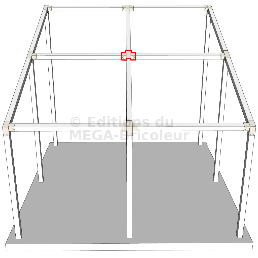 Connecteur métallique permettant l’assemblage précis de deux chevrons inclinés à 20°, de deux poutres horizontales et d’un poteau vertical central, tous de section 120x120 mm. Il garantit une liaison rigide et symétrique en un point central, assurant la stabilité de l’ensemble de la structure.