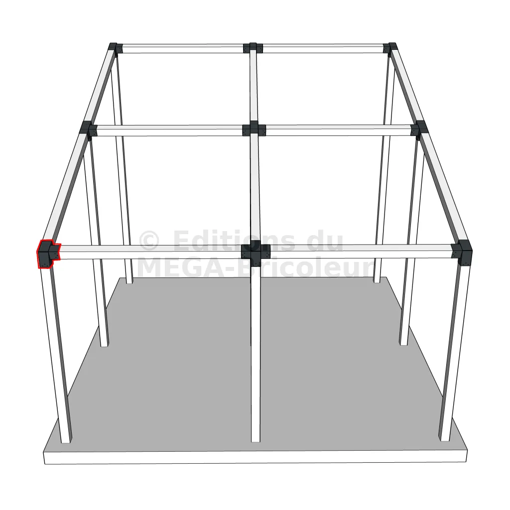 Il est utilisé dans un angle extérieur. Ce connecteur va permettre de raccorder une poutre 120x120mm à une poutre 120x120mm avec une pente de 20°, le tout étant supporté par un poteau vertical 120x120mm.