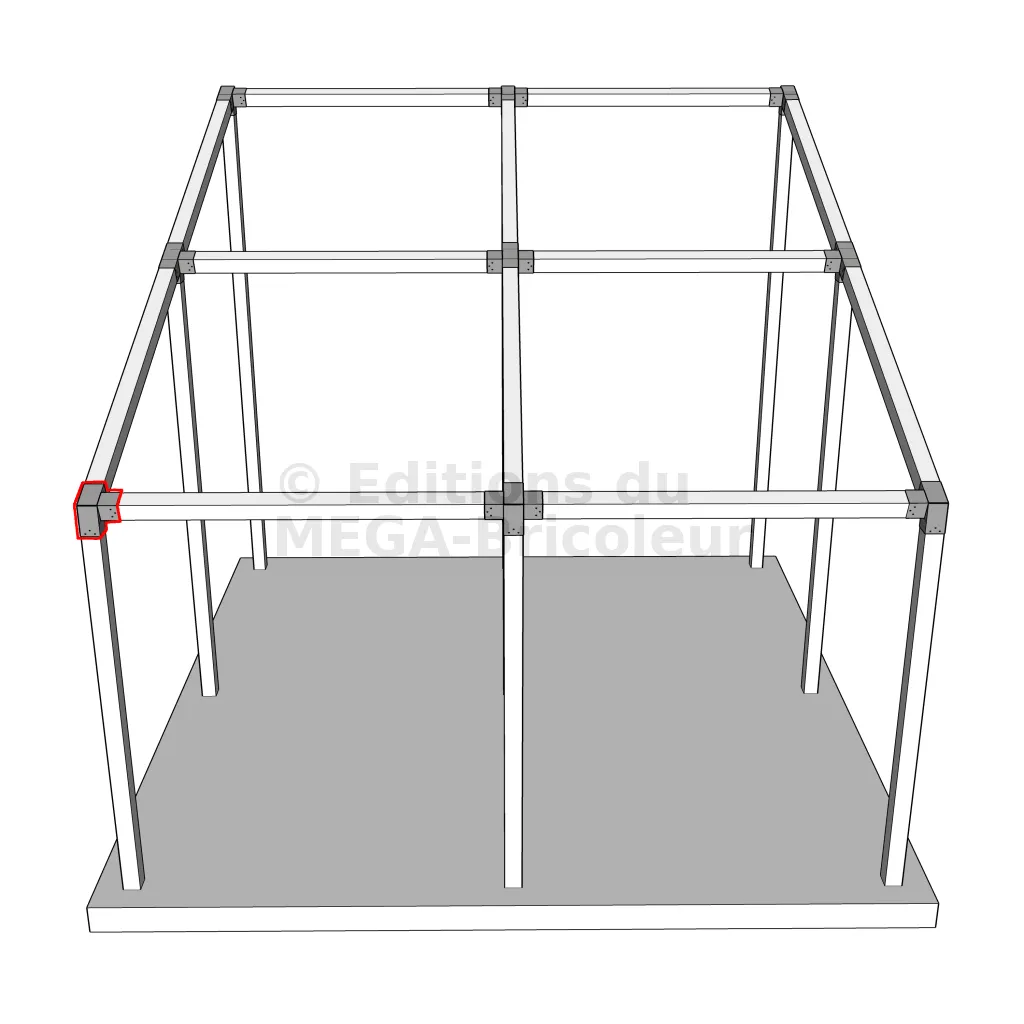Il est utilisé dans un angle extérieur. Ce connecteur va permettre de raccorder une poutre 120x120mm à une poutre 120x120mm avec une pente de 20°, le tout étant supporté par un poteau vertical 120x120mm.