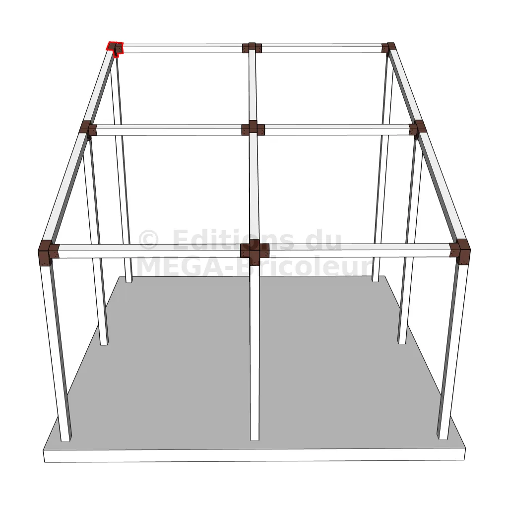 Il est utilisé dans un angle extérieur. Ce connecteur va permettre de raccorder une poutre 120x120mm à une poutre 120x120mm avec une pente de 20°, le tout étant supporté par un poteau vertical 120x120mm.