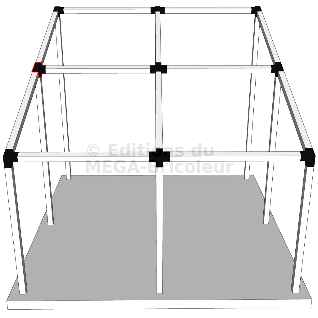 Connecteur d’angle intérieur à quatre directions, conçu pour l’assemblage de deux poutres en section 120x120 mm formant un angle de 20° avec un poteau vertical de même section. Il assure une liaison structurelle rigide et orthogonale à mi-hauteur, garantissant la stabilité de l’ensemble.