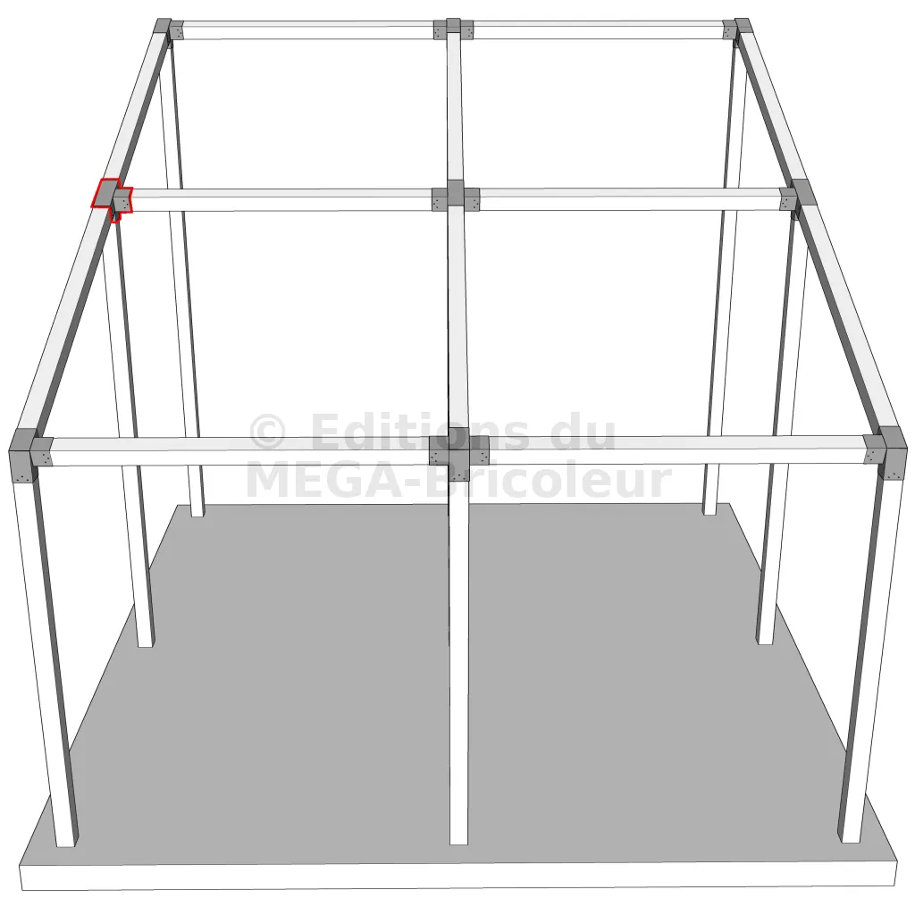 Connecteur d’angle intérieur à quatre directions, conçu pour l’assemblage de deux poutres en section 120x120 mm formant un angle de 20° avec un poteau vertical de même section. Il assure une liaison structurelle rigide et orthogonale à mi-hauteur, garantissant la stabilité de l’ensemble.