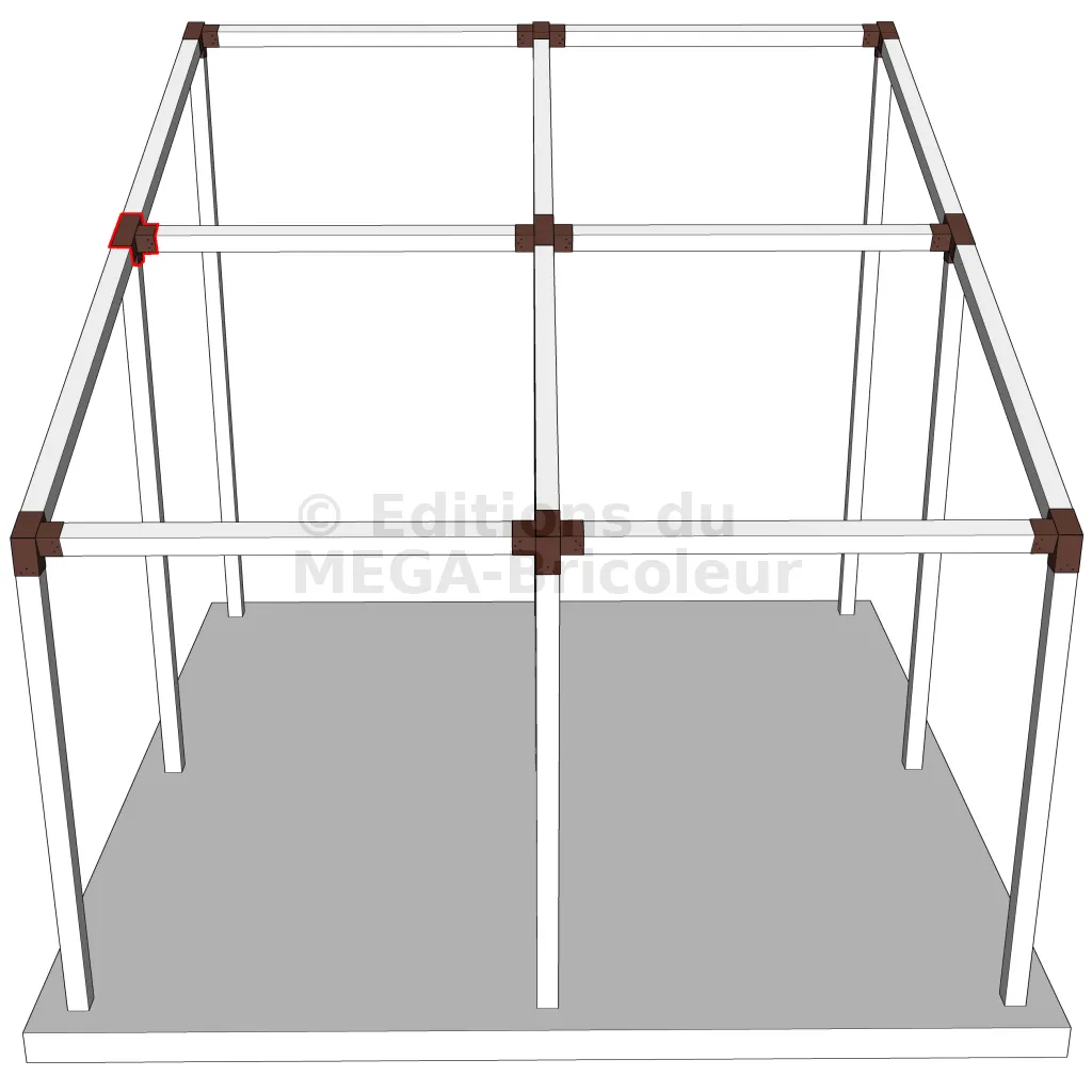 Connecteur d’angle intérieur à quatre directions, conçu pour l’assemblage de deux poutres en section 120x120 mm formant un angle de 20° avec un poteau vertical de même section. Il assure une liaison structurelle rigide et orthogonale à mi-hauteur, garantissant la stabilité de l’ensemble.