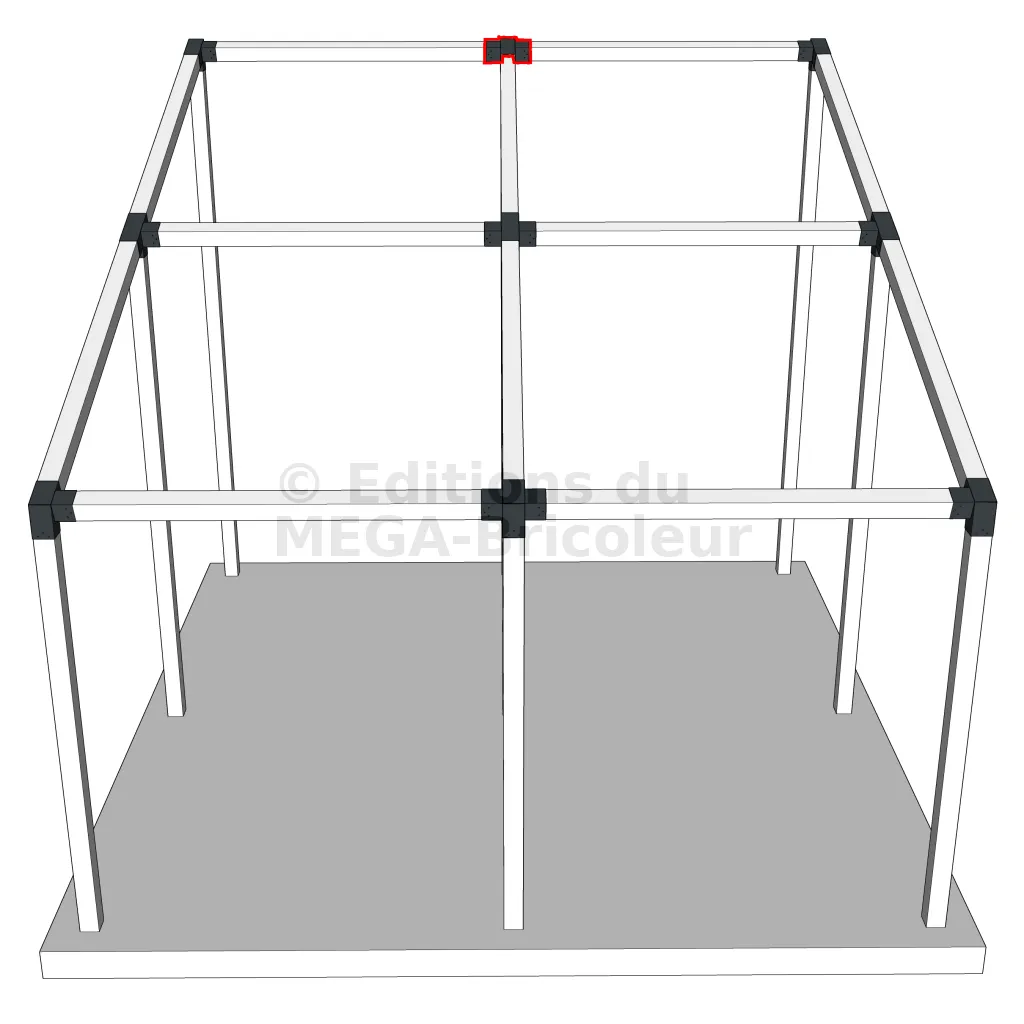 Connecteur d’angle intérieur à quatre directions conçu pour l’assemblage de poutres en section 120x120 mm avec un chevron de même section incliné à 20°. Il assure la jonction structurelle entre les éléments horizontaux, le chevron incliné et un poteau porteur vertical en 120x120 mm.