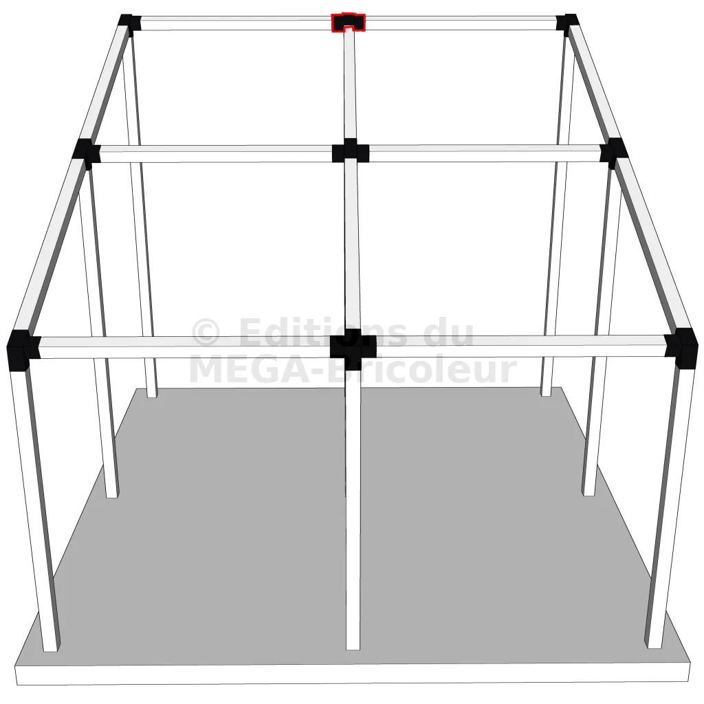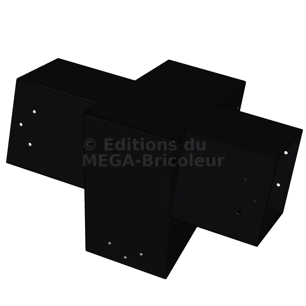 Connecteur d’angle intérieur à quatre directions conçu pour l’assemblage de poutres en section 120x120 mm avec un chevron de même section incliné à 20°. Il assure la jonction structurelle entre les éléments horizontaux, le chevron incliné et un poteau porteur vertical en 120x120 mm.
