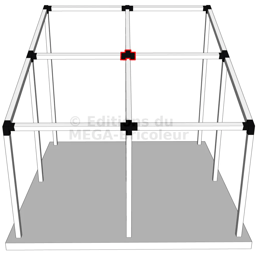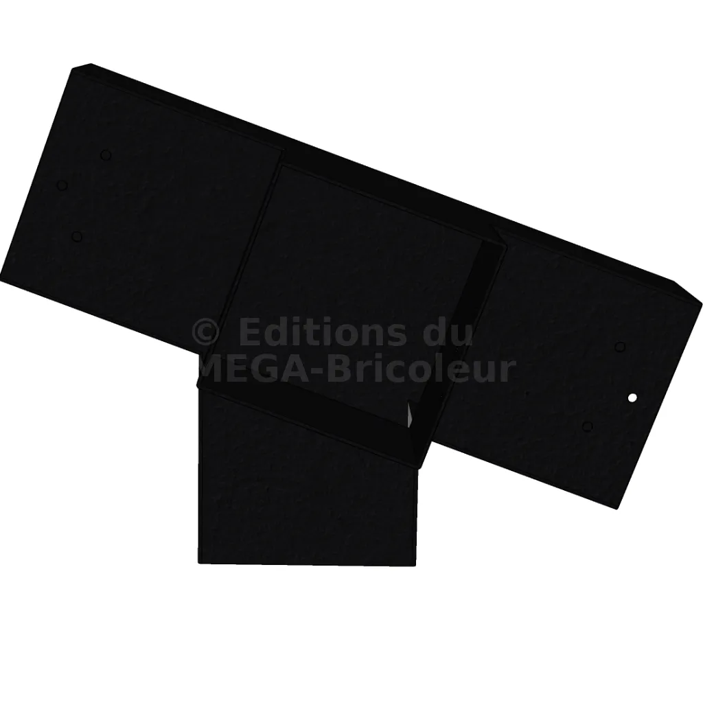 Connecteur métallique permettant l’assemblage précis de deux chevrons inclinés à 20°, de deux poutres horizontales et d’un poteau vertical central, tous de section 120x120 mm. Il garantit une liaison rigide et symétrique en un point central, assurant la stabilité de l’ensemble de la structure.