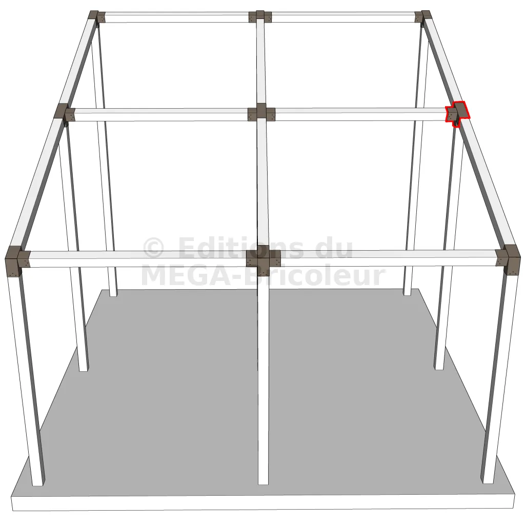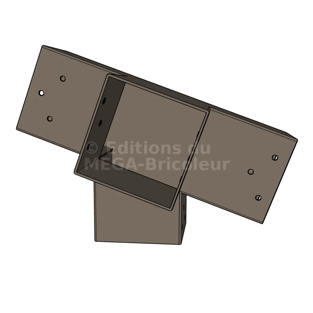Connecteur d’angle intérieur à quatre directions, conçu pour l’assemblage de deux poutres en section 90x90 mm formant un angle de 20° avec un poteau vertical de même section. Il assure une liaison structurelle rigide et orthogonale à mi-hauteur, garantissant la stabilité de l’ensemble.
