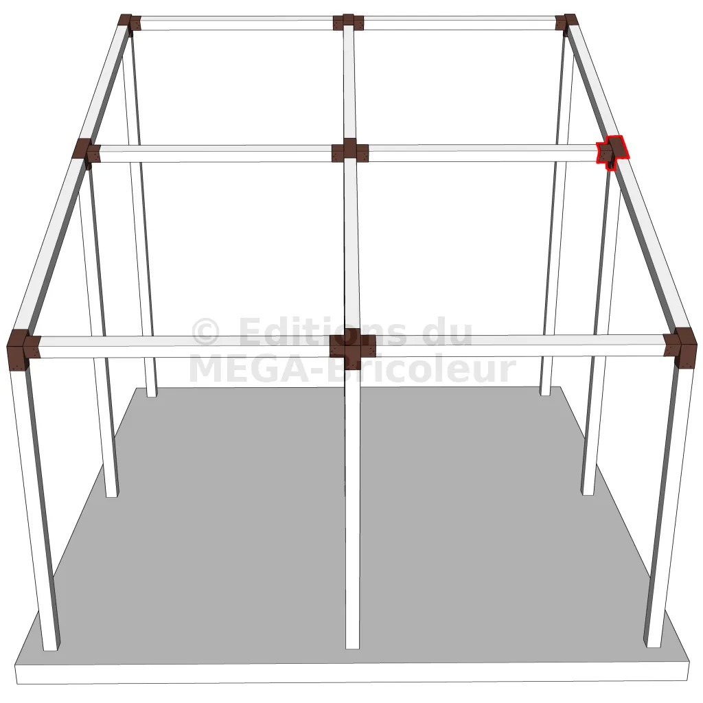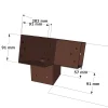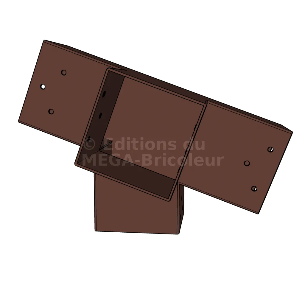 Connecteur d’angle intérieur à quatre directions, conçu pour l’assemblage de deux poutres en section 90x90 mm formant un angle de 20° avec un poteau vertical de même section. Il assure une liaison structurelle rigide et orthogonale à mi-hauteur, garantissant la stabilité de l’ensemble.