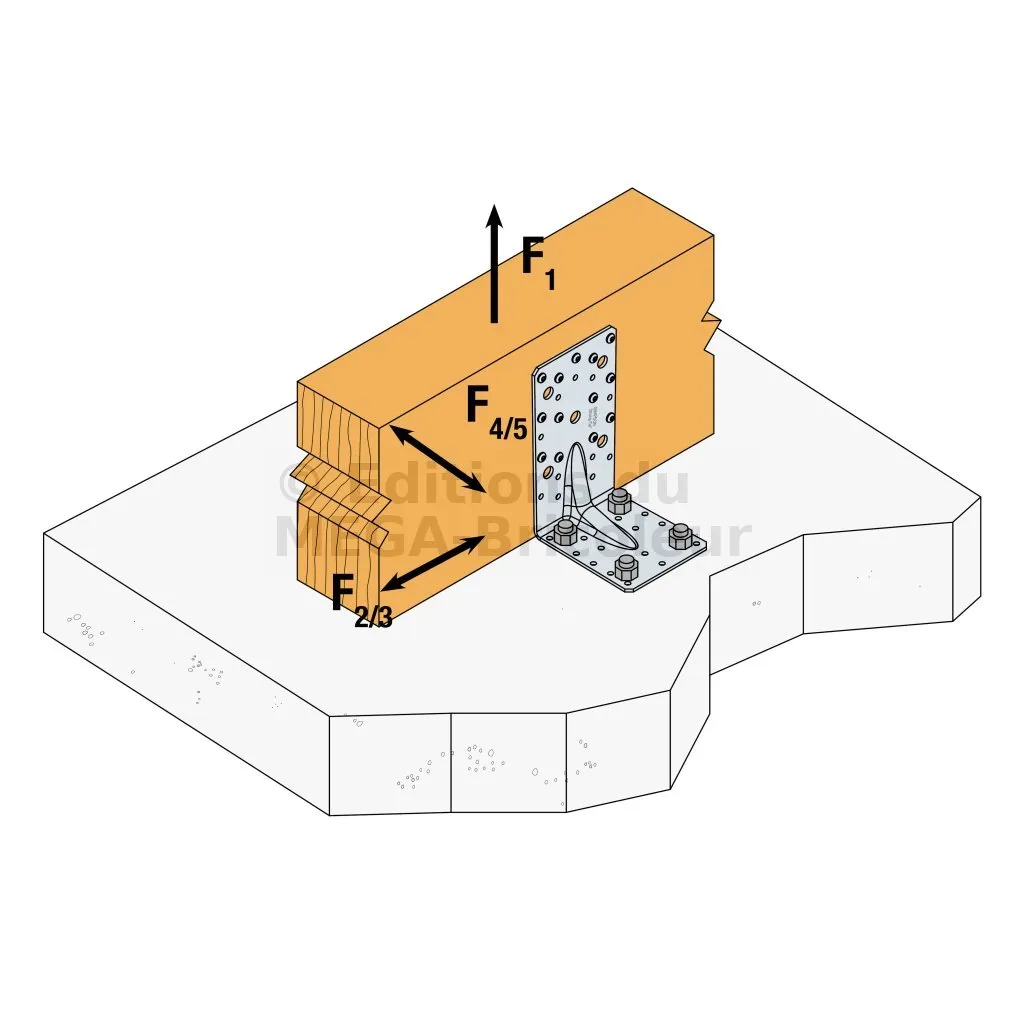 Le niveau de résistance design du boulon R#,d est déterminé par (coefficient boulon x charge design du connector F#,d) pour la direction d’effort et fixations correspondantes. Referez vous à la gamme d’ancrages Simpson Strong-Tie pour les ancrages adaptés. Les solutions classiques sont BOAXII, SET-XP, WA, AT-HP, en fonction du type de béton, espacement et distances aux bords.