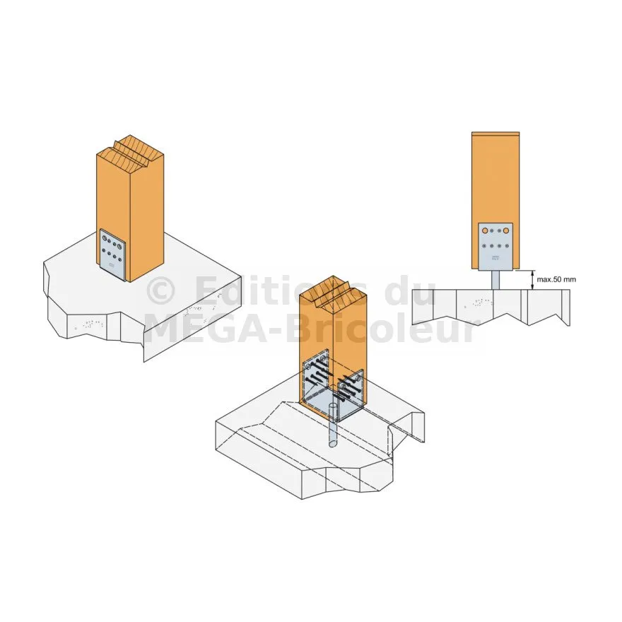 La distance entre la platine et le béton doit être de 50 mm maxi.