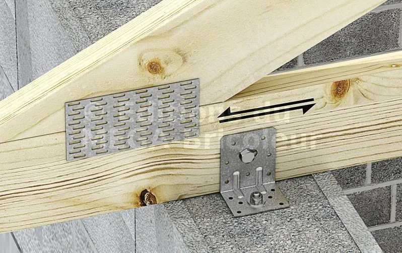 Dans le cas d’un déplacement calculé de la ferme de plus de 6 mm, il faut alors réaliser un appui glissant. Le glissement est autorisé par le trou oblong situé sur nos équerres (source DTU 31.3, P3/5.3.3)