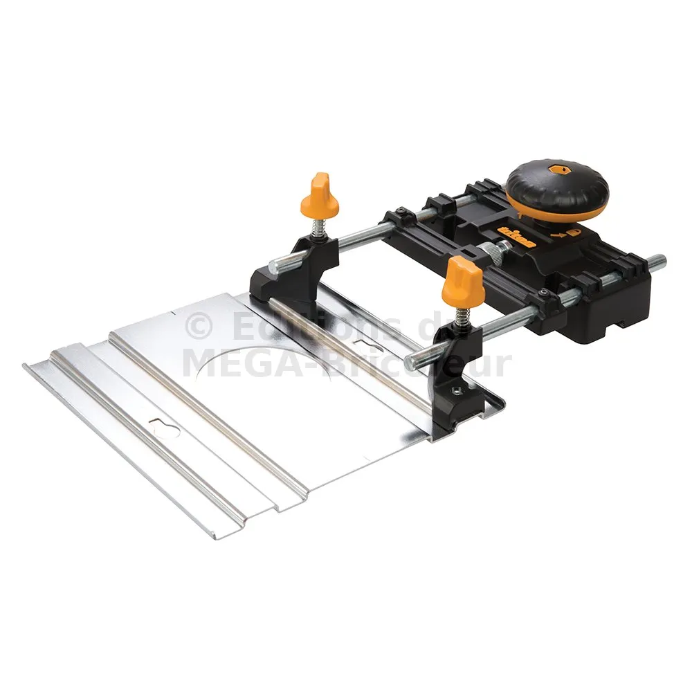 - Permet d’attacher des rails de guidage à la défonceuse en toute simplicité pour une meilleure stabilité et précision pour effectuer des lignes droites.