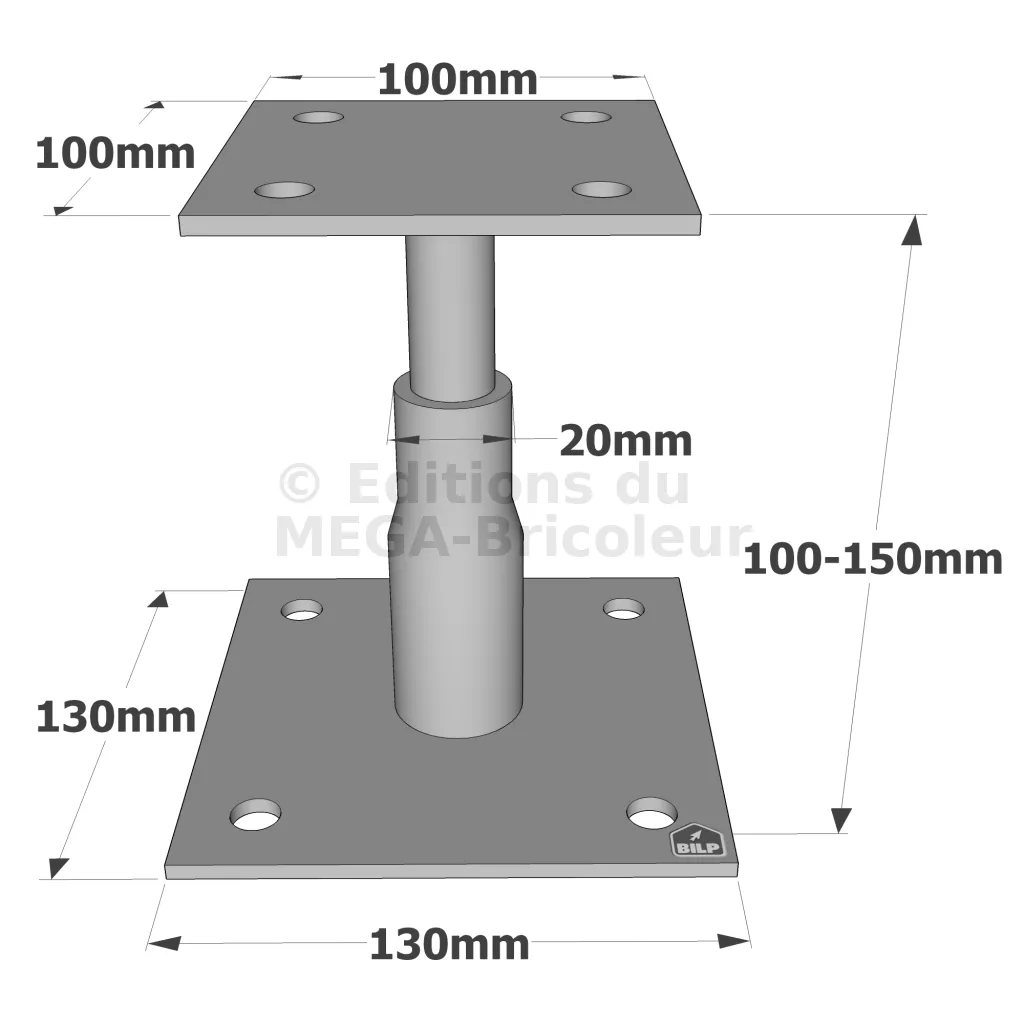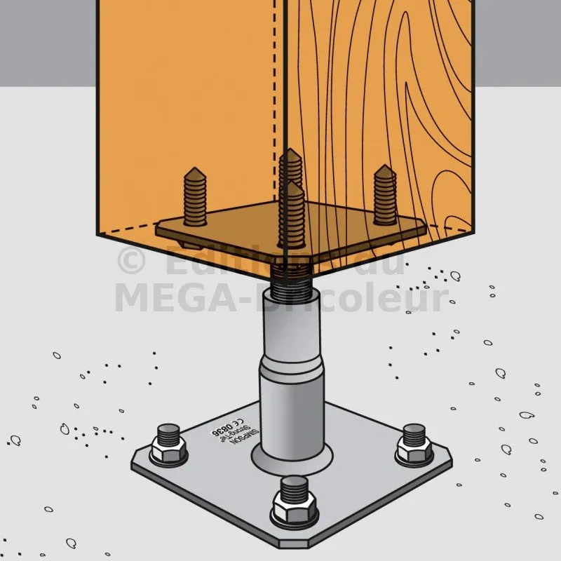 Ce pied de poteau est réglable en hauteur. Simple et rapide à installer, il peut être réglé sur le chantier.