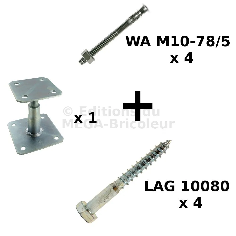 - Contenu1 x pied de poteau APB100/150 acier éléctrozingué ; 4 x goujons WA M10-78/5 en acier électrozingué (FM-753 3DG M10X75/5) ; 4 x tirefonds LAG10080
