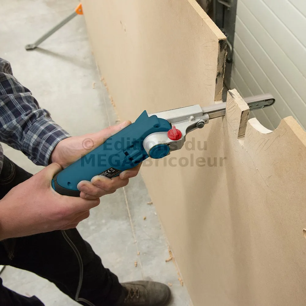 Équipée du contrôle de vitesse variable par une molette facile d’accès, vous pouvez choisir et changer la vitesse de rotation de la bande pour obtenir un débit de ponçage spécifique en fonction de la finition voulue, et selon la tâche et le matériau sur lequel vous travaillez. Sur la base du bras de la lime, se trouve une vis de tension/relâche qui tend ou détend la bande pour améliorer la performance, ainsi que de faciliter le retrait et le changement de la bande.