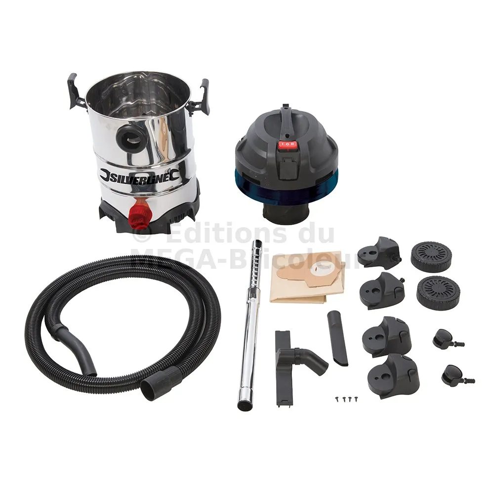 Aspirateur/souffleur puissant avec débit d’air de 58 L/s et une puissance d’aspiration de 18 kPa. Idéal pour l’atelier et pour utilisation générale. Prise de courant GB de 13 A et prise de force avec capacité jusqu’à 2 000 W (9 A). Fonction automatique d’extraction des poussières dès qu’un outil branché dans la prise de force est mis en marche. Réservoir en acier inoxydable d’une capacité de 30 L avec bouchon de vidange. Interrupteur facile à utiliser et cordon d’alimentation de 6 m. Comprend un tuyau de 2,5 m, un tube télescopique en acier inoxydable, un filtre réutilisable, un manchon en mousse, une brosse à sol de 250 mm, un sac à poussières, un suceur et des roulettes.